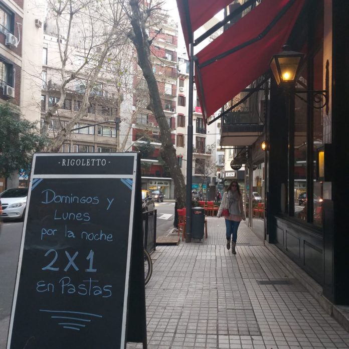 A través de una pizarra en la vereda de su local, ubicado en Rodríguez Peña 1291, anuncia a pura tiza que tiene disponible un «2×1 en sus platos de pastas los domingos y lunes por la noche».