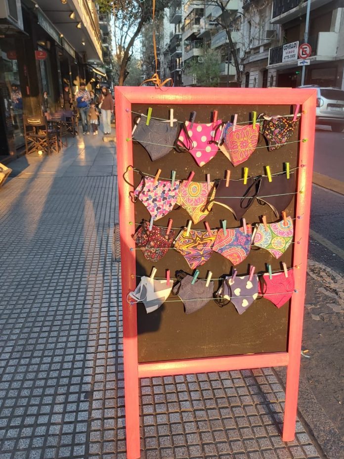 Se trata de María Tutti que en sintonía con la nueva normalidad, incorporó a su stock los tapabocas. Y para anoticiar a la gente, la marca optó por exhibir en la vereda sus coloridos productos de diversos diseños para niños y adultos.